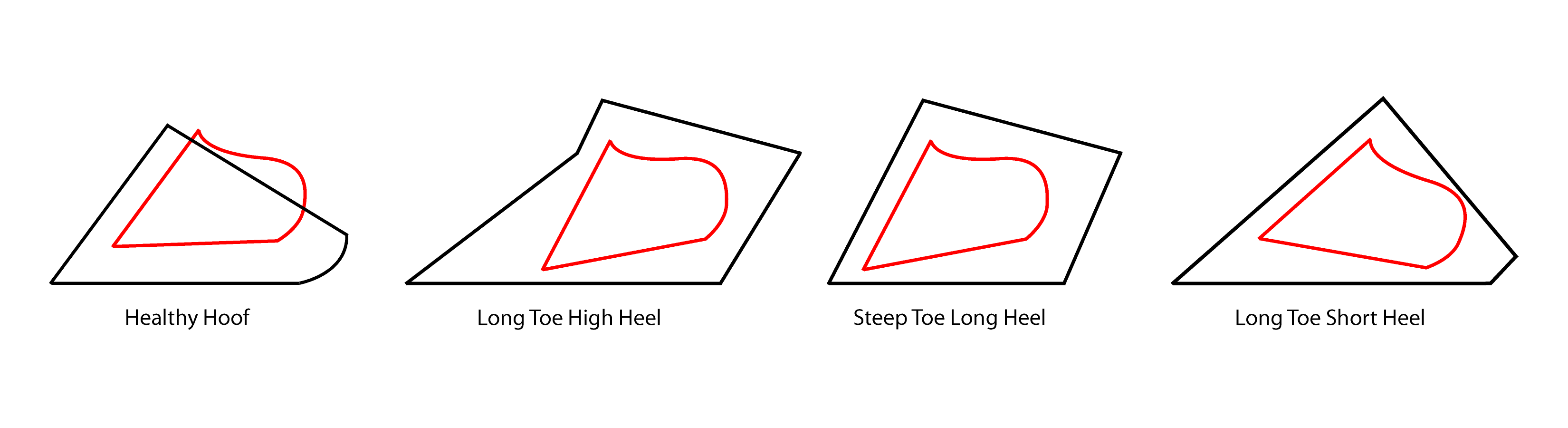 Probleme mit den Hufen sind weit verbreitet und meistens das Resultat der Hufeisen, welche eigentlich zur Verbesserung hätten beisteuern sollen. Nachfolgend ein paar Bilder, welche die typischen Hufprobleme aufzeigen, die ich in meiner Arbeit vorfinde. Jedes Hufproblem wirkt sich direkt auf die innere Struktur aus (das Hufbein in rot angezeigt). Kommt Ihnen eine dieser Hufformen bekannt vor?